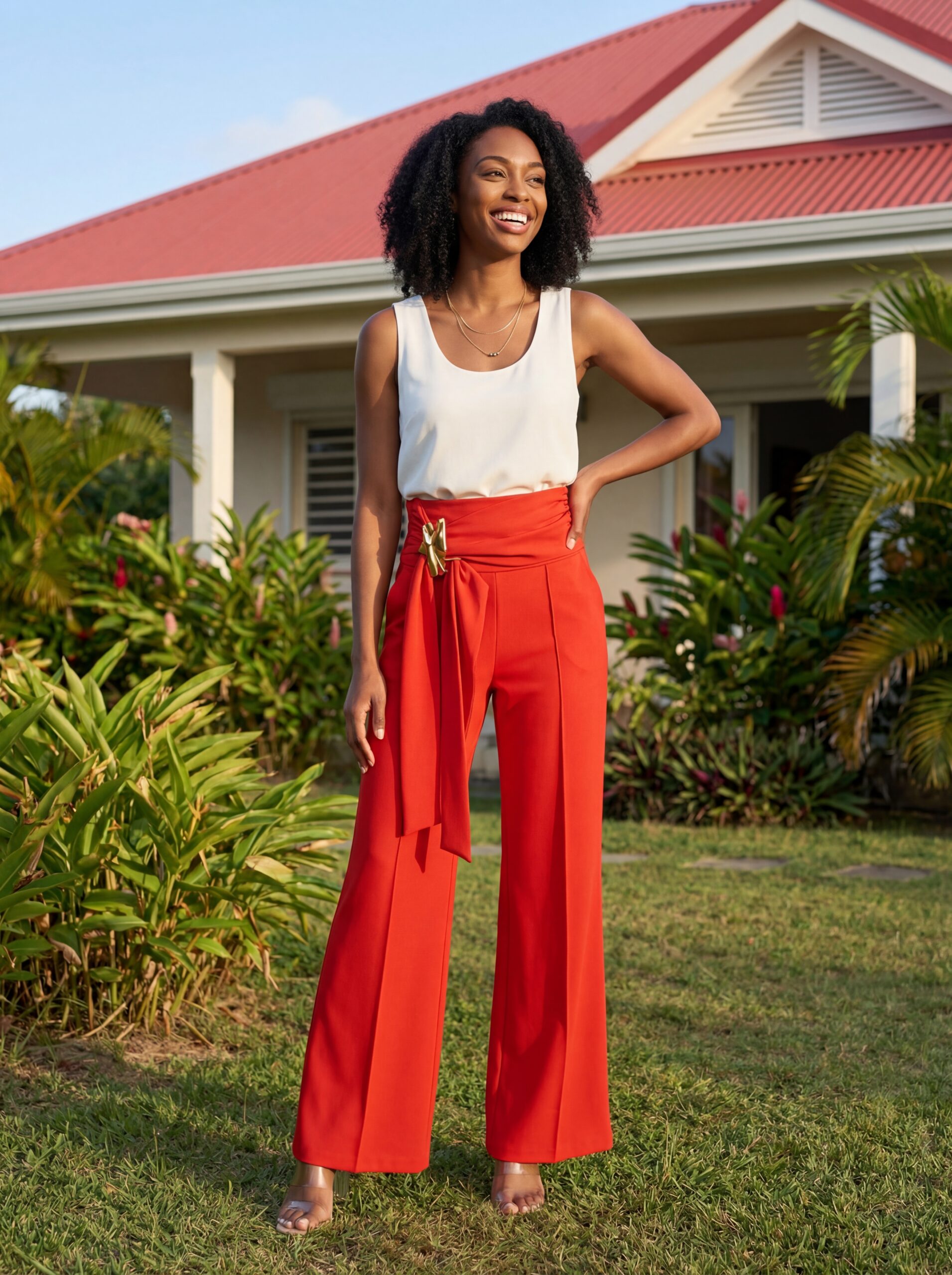 Audacieux et élégant, ce pantalon orange vif attire tous les regards avec sa coupe large et son tombé fluide. Sa taille haute drapée, sublimée par une boucle décorative, structure la silhouette avec originalité, tandis que sa matière légère assure confort et mouvement pour un look à la fois chic et affirmé.